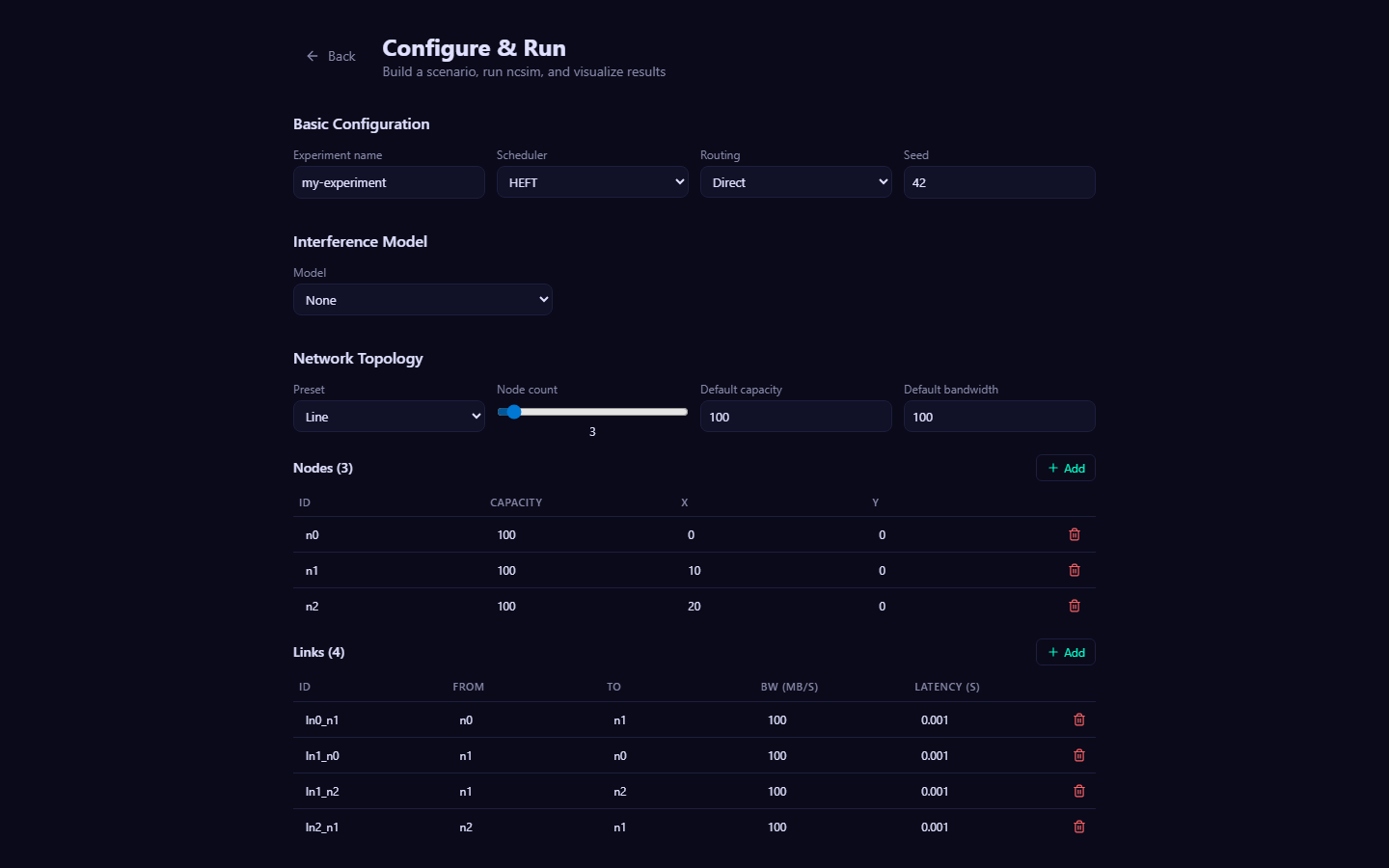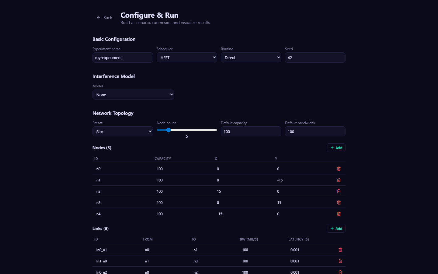 - A compute resource in the network. Each node has an ID, a compute capacity (units/second), and optionally a position (x, y in meters). Tasks are scheduled onto nodes by the scheduling algorithm.