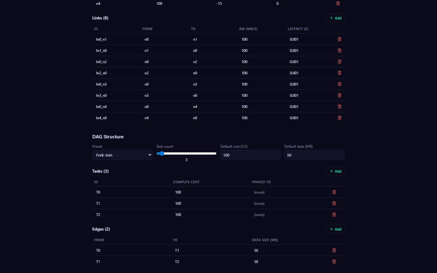 from), destination node (to), bandwidth (MB/s), and latency (seconds). Multiple concurrent transfers on the same link share its bandwidth equally.