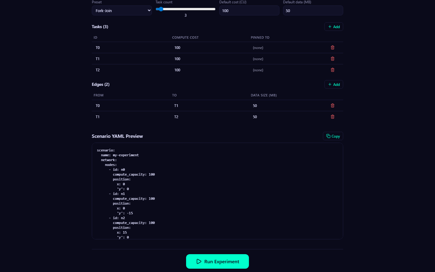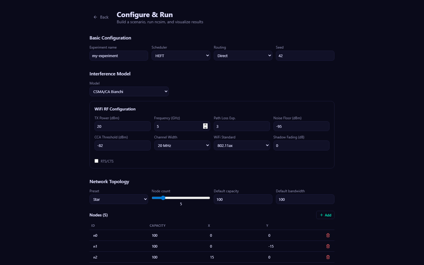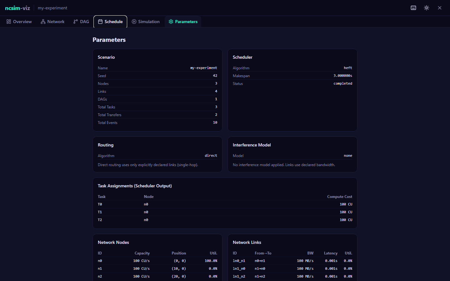 - A complete simulation specification in YAML format. Contains the network definition (nodes and links), one or more DAGs (tasks and edges), and configuration options (scheduler, routing, interference, seed, RF parameters).