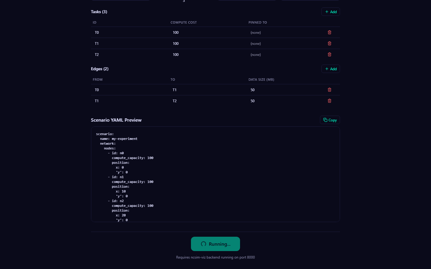 - You define a scenario in YAML: network topology, node capacities, link bandwidths, DAG task graphs, and configuration (scheduler, routing, interference model, seed).