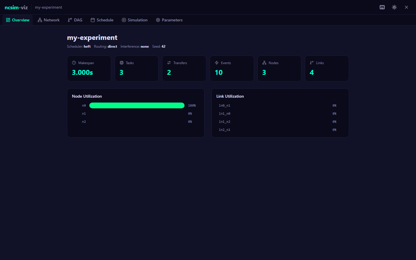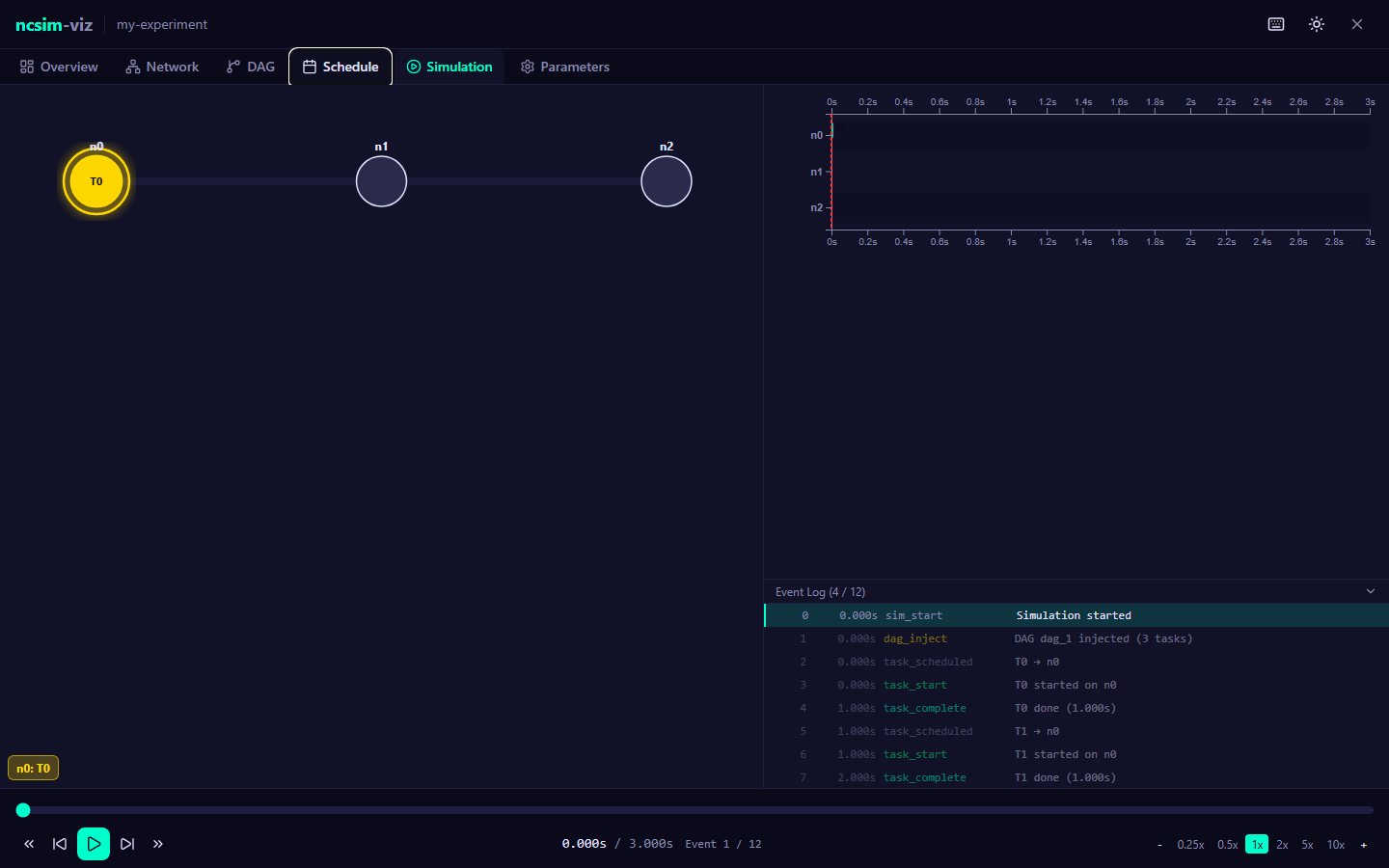 trace.jsonlafter each simulation run. Contains one JSON object per line, recording every discrete event in chronological order. Events include simulation start/end, DAG injection, task scheduling/start/completion, and transfer start/completion.