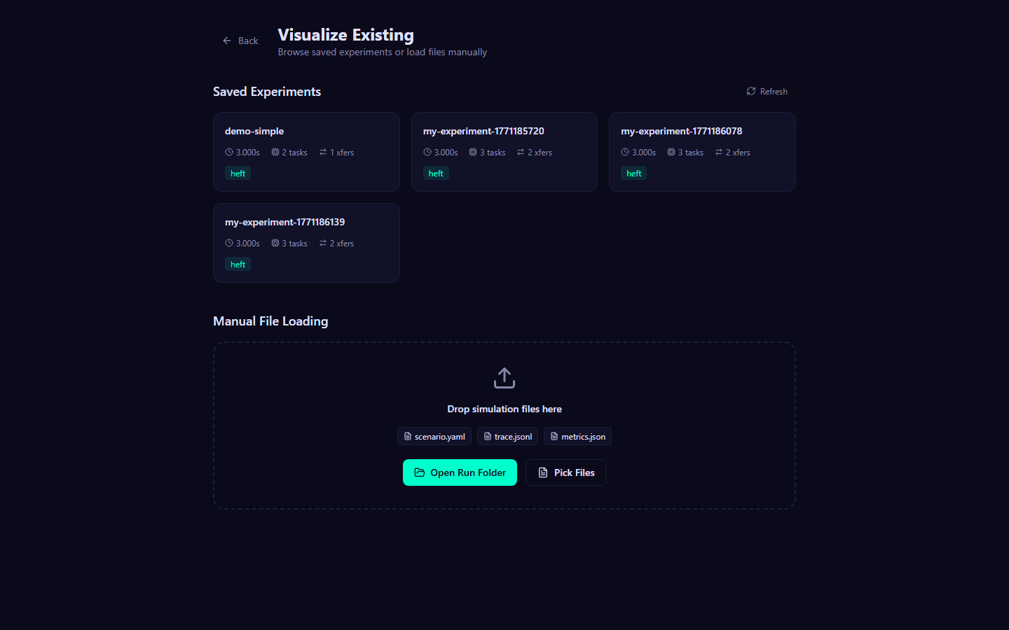 - Web visualization UI -- interactive experiment builder, Gantt charts, animated replay, and network topology views
